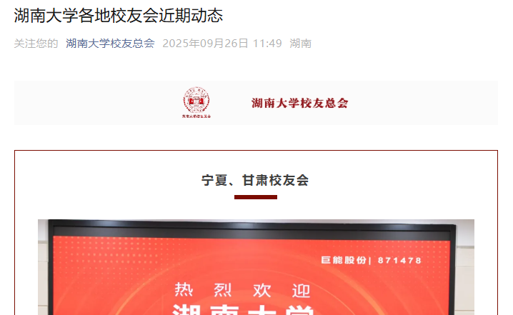 宁夏、甘肃校友会8月10日至14日,湖南大学原党委副书记、校友总会副会长、教育基金会理事长陈伟等一行赴宁夏、甘肃走访校友。与宁夏校友代表举行座谈,座谈会由79级校友、宁夏校友会会长雷顺京主持,62级校友、宁夏校友会名誉会长谢庭湘,宁夏巨能机器人董事长孙文靖校友,宁夏邮储银行副行长关晶奇等宁夏校友代表参加。与甘肃校友代表举行座谈,工程力学87级周建平校友、化学94级姚晓莉校友等甘肃校友代表参加。期间,陈伟一行...