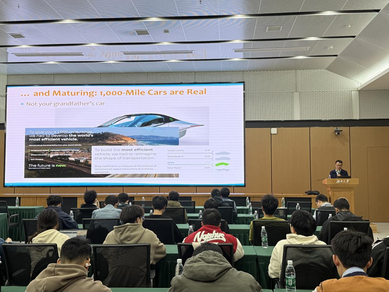 在师生交流环节,谭方东院士围绕电动汽车充电对电网运行与调度的影响、电动汽车安全性与全生命周期可靠性等问题进行了深入解答。他系统阐释了电池材料演进、热管理架构优化与整车安全设计前沿进展,重点强调从材料体系、功率器件到系统协同的多层次创新路径。同时,谭方东院士指出,随着电动交通与能源系统加速融合,车网互动、高效能量管理与多尺度安全保障将成为推动电动汽车与新型电力系统协同发展的关键方向,为构建高比例电动化、智能化的未来能源—交通系统提供重要技术支撑。