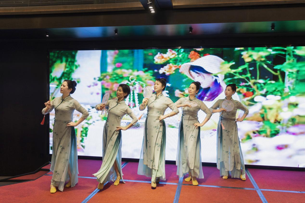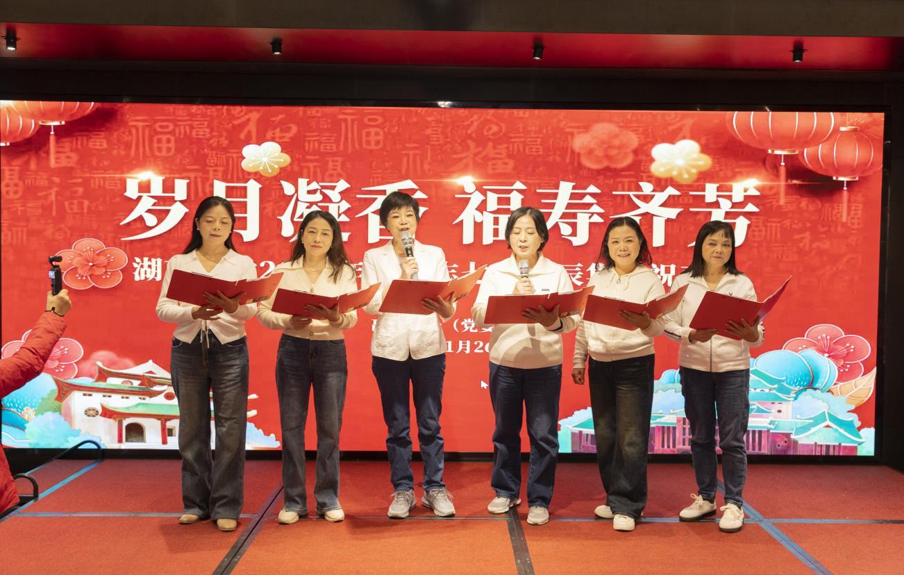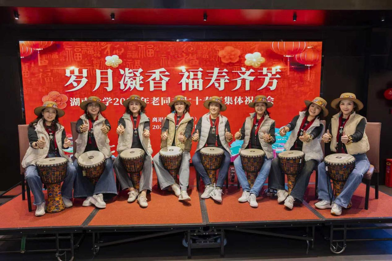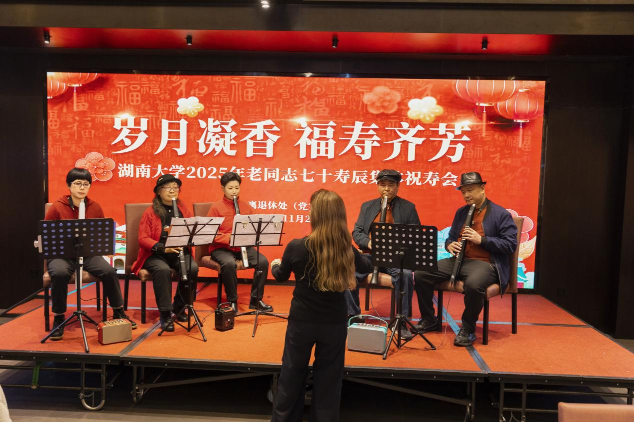 祝寿会上,学校老年大学爱晚协会的文艺社团带来精彩文艺表演。朗诵《永远的风华正茂》声情并茂,电吹管演奏《搀扶》《好日子》旋律悠扬,花鼓戏《你待同志亲如一家》韵味十足,舞蹈《望春词》轻盈灵动,男声独唱《来到遥远的地方》高亢嘹亮,京剧《纤云弄巧》唱腔醇厚,非洲鼓表演《亚丽古娜》热情洋溢,赢得现场阵阵掌声。