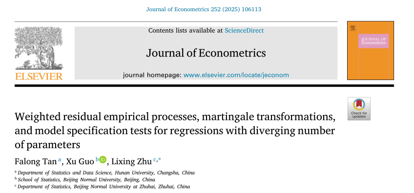 近日,金融与统计学院谭发龙教授在高维统计领域取得研究进展,研究成果以“Weighted residual empirical processes, martingale transformations,and model specification tests for regressions with diverging numberof parameters”为题在计量经济学国际期刊Journal of Econometrics在线发表。 模型设定检验问题是统计学和计量经济学中基本问题之一。尽管现有文献中已有对该问题的大量研究,但在维数发散时的高维模...