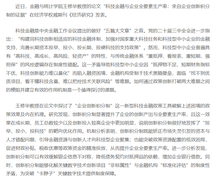 近日,金融与统计学院王修华教授的论文“科技金融与企业全要素生产率:来自企业创新积分制的证据”在经济学权威期刊《经济研究》发表。科技金融是中央金融工作会议提出的做好“五篇大文章”之首。党的二十届三中全会进一步指出:“构建同科技创新相适应的科技金融体制,加强对国家重大科技任务和科技型中小企业的金融支持,完善长期资本投早、投小、投长期、投硬科技的支持政策”。然而,科技型中小企业普遍具有“高科技、高成...