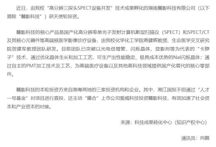 近日,由我校“高分辨三探头SPECT设备开发”技术成果孵化的湖南麓影科技有限公司(以下简称“麓影科技”)获天使轮投资。麓影科技的核心产品是国产化高分辨率单光子发射计算机断层扫描仪(SPECT)和SPECT/CT及其核心元器件等高端核医学影像诊疗设备,由我校化学化工学院蒋健晖教授、生命医学交叉研究院贺建军教授团队研发。目前团队已突破以光电倍增管、闪烁晶体、显影剂等为代表的“卡脖子”技术,通过优化晶体生长和加工工艺...