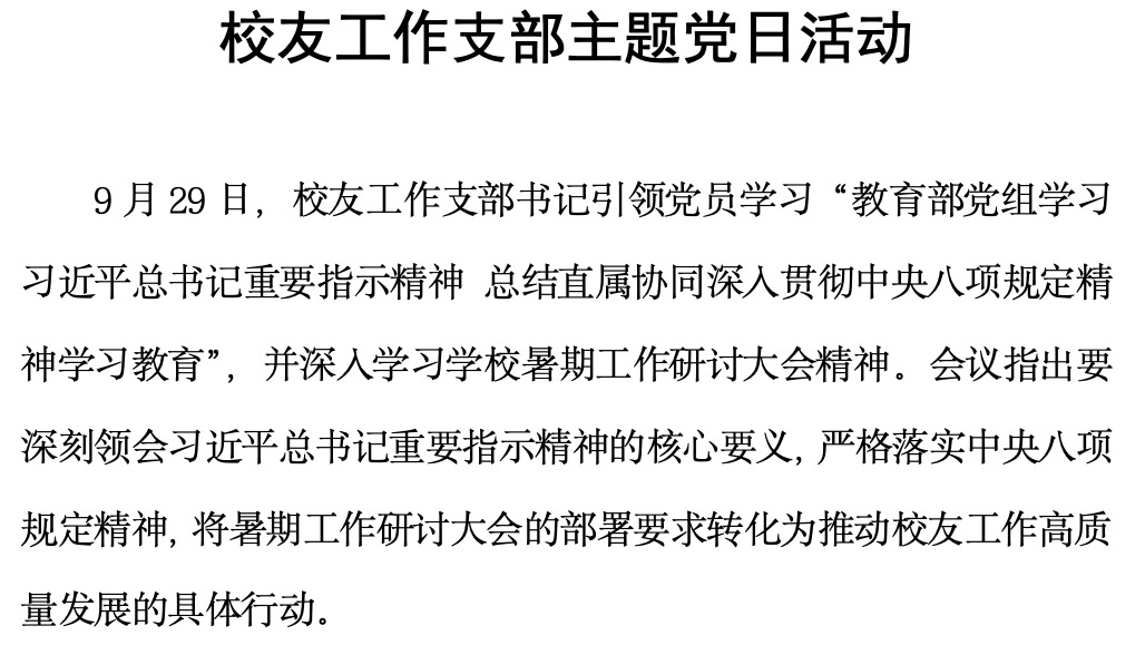 9月29日,校友工作支部书记引领党员学习“教育部党组学习习近平总书记重要指示精神 总结直属协同深入贯彻中央八项规定精神学习教育”,并深入学习学校暑期工作研讨大会精神。会议指出要深刻领会习近平总书记重要指示精神的核心要义,严格落实中央八项规定精神,将暑期工作研讨大会的部署要求转化为推动校友工作高质量发展的具体行动。结合部门工作职责与实际,讨论“亲和谐畅”机关治理文化的具体表现与实现路径。会上,支部党...