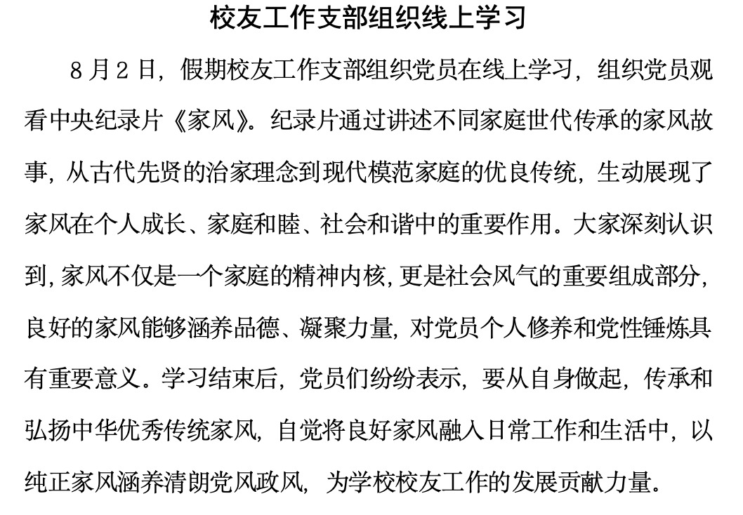 8月2日,假期校友工作支部组织党员在线上学习,组织党员观看中央纪录片《家风》。纪录片通过讲述不同家庭世代传承的家风故事,从古代先贤的治家理念到现代模范家庭的优良传统,生动展现了家风在个人成长、家庭和睦、社会和谐中的重要作用。大家深刻认识到,家风不仅是一个家庭的精神内核,更是社会风气的重要组成部分,良好的家风能够涵养品德、凝聚力量,对党员个人修养和党性锤炼具有重要意义。学习结束后,党员们纷纷表示,...