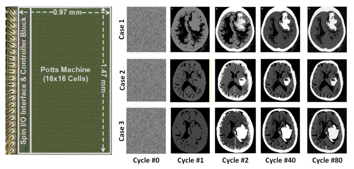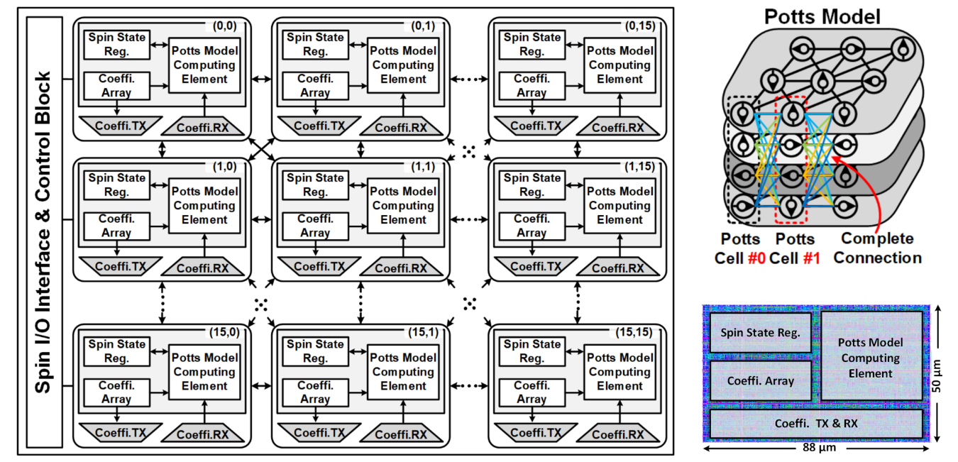 为攻克这一难题,我校半导体学院陈卓俊教授团队成功研发出面向复杂组合优化问题的全集成波茨机处理器芯片。该芯片基于65nm CMOS工艺制造,集成256个自旋单元,支持2至4比特耦合系数位宽及King’s Graph自旋网络拓扑,单个自旋面积仅为4400 μm²。芯片已在CT图像聚类、合金相变模拟等实际应用中完成验证,展现出优越的面积效率与能效表现。