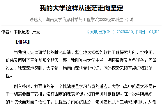 讲述人:湖南大学信息科学与工程学院2022级本科生 邵帅【讲述】 当我提交完读研学校的推免申请,坚定地选择智能软件工程探索方向,恍惚间,仿佛又回到了三年前那个秋天。那时我刚迎来大学生活,满怀憧憬又有些迷茫。回望过去,我深深地感到,大学是一场向内深耕专业知识,向外探索无限可能的精彩旅程。 刚入校时,我面临的第一个挑战便是学习节奏的适应。大学与高中的最大不同在于一切需要自主安排,没有固定的课表督...